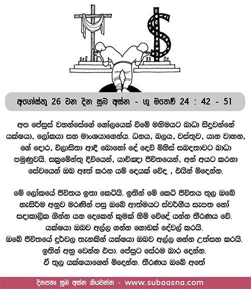 42 එබැවින් අවදි ව ඉන්න. ඔබගේ සමිඳාණන් වහන්සේ කිනම් දවසක එන සේක් දැ යි ඔබ නොදන්නහු ය. 43 සොරා කොයි යාමයේ එන්නේ දැ යි ගෙදර ස්වාමියා දැන සිටියේ නම්, ඔහු නොනිදා සිට තමාගේ ගෙය බිඳීමට ඉඩ නොදෙන බව දැනගන්න. 44 එබැවින් ඔබත් සූදානම් ව සිටින්න. කුමක්නිසා ද ඔබ බලාපොරොත්තු නොවන පැයක දී මනුෂ්ය-පුත්රයාණෝ වඩින සේක.”