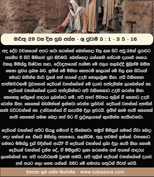 1 ඉන්පසු ජුදෙව්වරුන්ගේ මංගල්යයක් විය. ජේසුස් වහන්සේ ද ජෙරුසලමට වැඩම කළ සේක. 2 ජෙරුසලමෙහි බැටළු දොරටුව ළඟ, හෙබ්රෙව් බසින් ‘බෙතෙස්දා’ යයි නම් ලත් පොකුණක් විය. එය අවට ද්වාර මණ්ඩප පහක් විය. 3 ඒවායෙහි අන්ධ වූ ද කොර වූ ද අංශභාග වූ ද රෝගීන් සමූහයක් ඔත්පළ ව සිටියෝ ය. 5 එහි තිස් අට අවුරුද්දක් රෝගී ව සිටි එක් මිනිසෙක් විය. 6 ඒ මිනිසා හාන්සි වී සිටිනු ජේසුස් වහන්සේ දැක, ඔහු බොහෝ කලක් එහි සිටි බව දැන, ”ඔබ සුව වීමට කැමැති දැ”යි ඔහුගෙන් ඇසූ සේක. 7 රෝගියා උන් වහන්සේට උත්තර දෙමින්, ”ස්වාමීනි, වතුර කැළඹෙන විට මා පොකුණට බස්වන්නට කිසිවෙක් නැත. මා එන අතර, අන් කෙනෙක් මට පළමුවෙන් බසින්නේ ය”යි කීවේ ය. 8 ”නැඟිට ඔබේ පැදුර රැගෙන යන්නැ”යි ජේසුස් වහන්සේ ඔහුට වදාළ සේක. 9 එකෙණෙහි ම මිනිසා සුවපත් වී, සිය පැදුර රැගෙන යන්නට ගියේ ය.