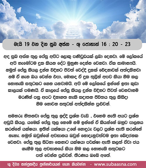23 ”ඒ දවසේ දී ඔබ කිසි ප්රශ්නයක් මාගෙන් අසන්නේ නැත. ඒකාන්තයෙන් ම මම ඔබට කියමි, මාගේ නාමයෙන් ඔබ පියාණන් වහන්සේගෙන් යමක් ඉල්ලුවොත්, උන් වහන්සේ ඒ දේ ඔබට දෙන සේක.