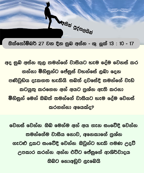 10 උන් වහන්සේ සබත් දිනක එක් ධර්මශාලාවක අනුශාසනා කරමින් සිටි සේක. 11 එහි දසඅට වසක් තිස්සේ අශුද්ධාත්මයක් නිසා දුර්වලකමින් පෙළුණු, කොයි අන්දමකින් වත් කෙළින් වෙන්නට බැරි ස්ත්රියක් වූවා ය. 12 ජේසුස් වහන්සේ ඈ දැක කැඳවා, ”ස්ත්රිය, ඔබේ දුර්වල කමින් ඔබ මිදුණෙහි ය”යි කියා 13 ඈ පිට අත් තැබූ සේක. එකෙණෙහි ම ඈ කෙළින් සිට, දෙවියන් වහන්සේට ප්රශංසා කළා ය. 14 ජේසුස් වහන්සේ සබත් දිනයේ දී සුව කළ බැවින් ධර්මශාලා නායකයා කෝප ව සමූහයා අමතා, ”වැඩපල සඳහා සදවසක් ඇත. සබත් දිනයේ නොව වෙන දවස්වල අවුත් සුවය ලබාගන්නැ”යි ඔවුන්ට කී ය. 15 සමිඳාණන් වහන්සේ ඔහුට උත්තර දෙමින්, ”කෛරාටිකයෙනි, ඔබ හැම කෙනෙකු ම සබත් දිනයේ දී තමාගේ ගොනා හෝ කොටළුවා හෝ ගාලෙන් ලිහා වතුර දීමට ගෙන යනවා නොවේ ද? 16 එසේ නම්, දසඅට වසක් තිස්සේ සාතන් විසින් බඳිනු ලැබ සිටි, ආබ්රහම්ගේ දියණියක වූ මේ ස්ත්රිය ඒ බන්ධනයෙන් සබත් දිනයේ දී මුදන්න යුතු ව තිබුණා නොවේ දැ”යි වදාළ සේක. 17 මෙසේ වදාළ විට උන් වහන්සේගේ සියලු විරුද්ධවාදීහු ලජ්ජාවට පත් වූ හ. මුළු සමූහයා ද උන් වහන්සේ කළ මහිමාන්විත ක්රියා සියල්ල ගැන අමන්දානන්දයට පත් වූ හ.