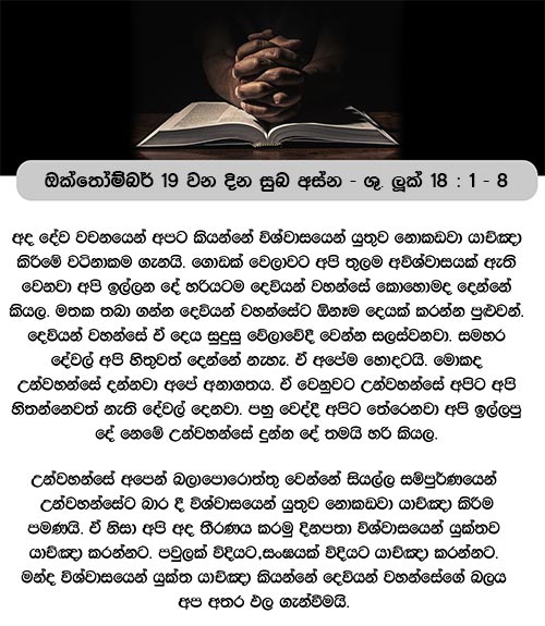 ඔක්තෝම්බර් 19 වන දින සුබ අස්න – ශු. ලූක් 18 : 1 – 8ඔවුන් අධෛර්ය නොවී නොකඩවා යාච්ඤාවෙහි යෙදිය යුතු බව දක්වන පිණිස උන් වහන්සේ ඔවුන්ට මේ උපමාව වදාළ සේක. ( ශු. ලූක් 18 : 1 )
