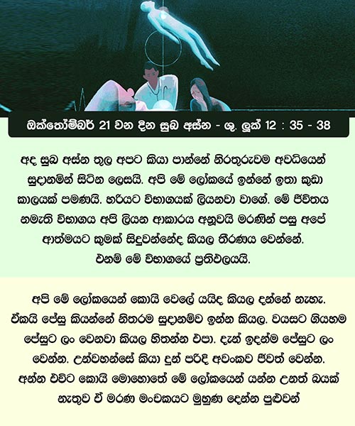 ඔක්තෝම්බර් 21 වන දින සුබ අස්න – ශු. ලූක් 12: 35 – 38ඔබ බලාපොරොත්තු නොවන පැයක දී මනුෂ්ය-පුත්රයාණන් වඩින නිසා ය.