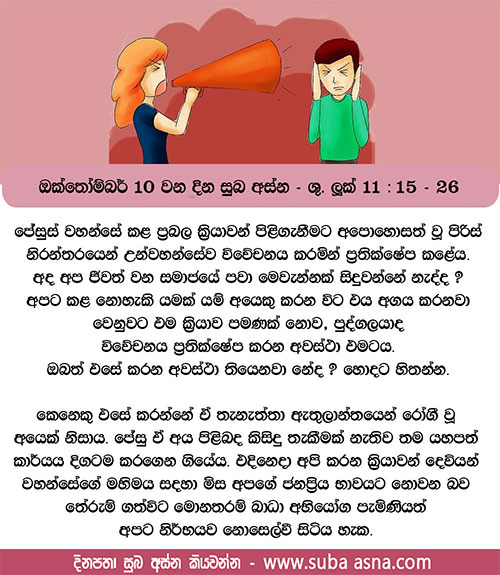 ඔක්තෝම්බර් 10 වන දින සුබ අස්න – ශු. ලූක් 11: 15 – 26මම දෙවියන් වහන්සේගේ අනුහසින් දුෂ්ටාත්මයන් දුරු කරම් නම්, සැබැවින් ම දෙවියන් වහන්සේගේ රාජ්යය ඔබ කෙරෙහි උදා වී ඇත.