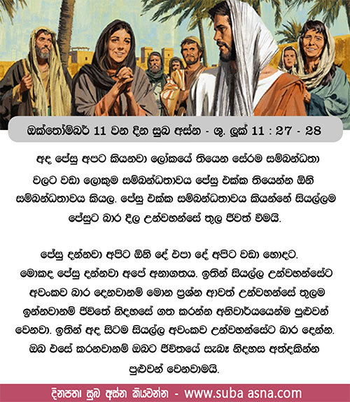 ඔක්තෝම්බර් 11 වන දින සුබ අස්න – ශු. ලූක් 11: 27 – 28දෙවියන් වහන්සේගේ වචනය අසා එය පිළිපදින අය ඊටත් වඩා භාග්යවන්ත ය