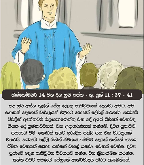 ඔක්තෝම්බර් 14 වන දින සුබ අස්න – ශු. ලූක් 11: 37 – 41පරිසිවරුනි, ඔබ කෝප්පයේ ද පිඟානේ ද පිටපැත්ත සෝදා පිරිසුදු කරන්නාහු ය; එහෙත් ඔබගේ ඇතුළත තණ්හාවෙන් ද දුෂ්ට චේතනාවෙන් ද පිරී ඇත.