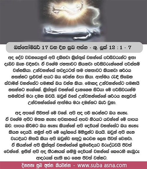 ඔක්තෝම්බර් 17 වන දින සුබ අස්න – ශු. ලූක් 12: 1 – 7ඔබ නැසුණු පසු නිරයේ හෙළීමට බලය ඇති තැනැන් වහන්සේට බිය වන්න