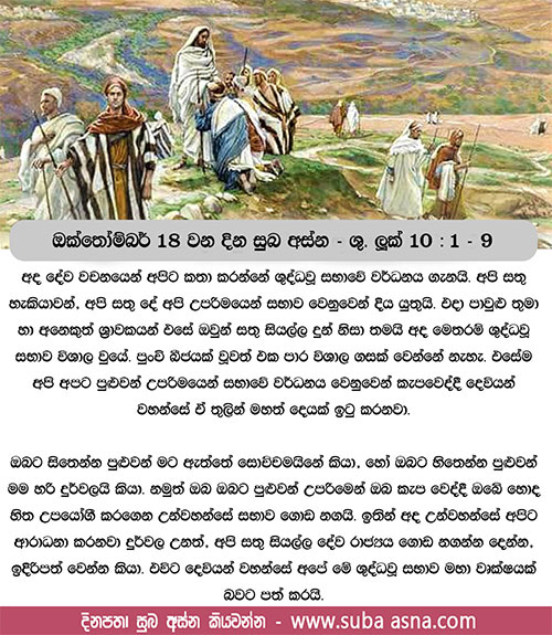 ඔක්තෝම්බර් 18 වන දින සුබ අස්න – ශු. ලූක් 10: 1 – 9ගොයම නම් බහුල ය. ගොවීහු විරල ය.