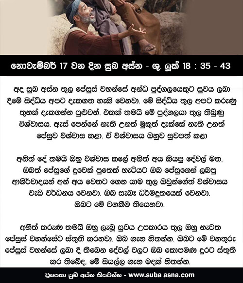 නොවැම්බර් 17 වන දින සුබ අස්න – ශු. ලූක් 18 : 35 – 43ඔබේ ඇදහිල්ල ඔබ සුව කෙළේය. ( ශු. ලූක් 18 : 42 )