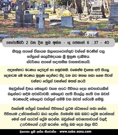 නොවැම්බර් 02 වන දින සුබ අස්න – ශු. ජොහාන් 6 : 37 – 40පුත්රයාණන් වහන්සේ දැක උන් වහන්සේ අදහාගන්නා හැම කෙනෙකු ම සදාතන ජීවනය ලැබීම මාගේ පියාණන් වහන්සේගේ කැමැත්තය. ( ශු. ජොහාන් 6 : 40 )