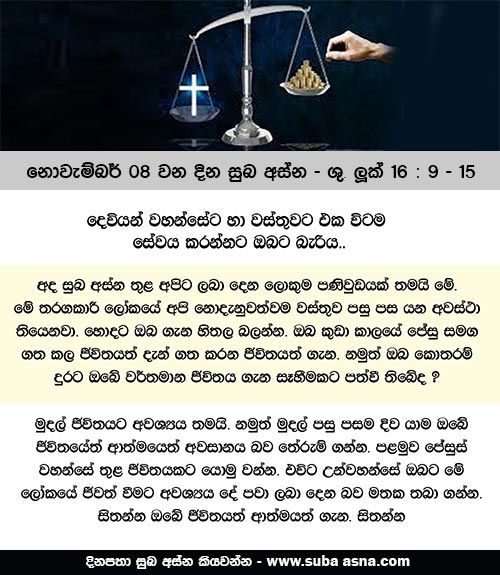 නොවැම්බර් 08 වන දින සුබ අස්න – ශු. ලූක් 16 : 9 – 15දෙවියන් වහන්සේට හා වස්තුවට එකවිට ම සේවය කරන්නට ඔබට බැරි ය. ( ශු. ලූක් 16 : 13 )