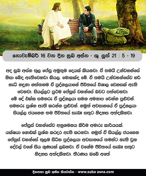 නොවැම්බර් 16 වන දින සුබ අස්න – ශු. ලූක් 21: 5 – 19ස්ථීර ව සිටීමෙන් ඔබ ජීවනය දිනා ගන්නහු ය.