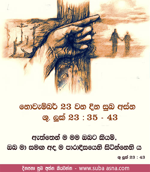 නොවැම්බර් 23 වන දින සුබ අස්න – ශු. ලූක් 23: 35 – 43ඇත්තෙන් ම මම ඔබට කියමි, ඔබ මා සමඟ අද ම පාරාදීසයෙහි සිටින්නෙහි ය