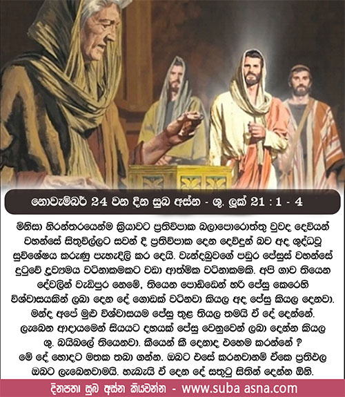 නොවැම්බර් 24 වන දින සුබ අස්න – ශු. ලූක් 21: 1 – 4ඇත්තෙන් ම මම ඔබට කියමි, මේ දිළිඳු වැන්දඹුව අනෙක් හැමට ම වඩා පඬුරු දැම්මා ය.