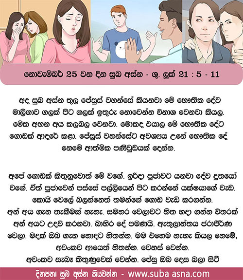 නොවැම්බර් 25 වන දින සුබ අස්න – ශු. ලූක් 21: 5 – 11ජාතියක් ජාතියකට විරුද්ධ ව ද රාජ්යයක් රාජ්යයකට විරුද්ධ ව ද නැඟිටිනු ඇත.
