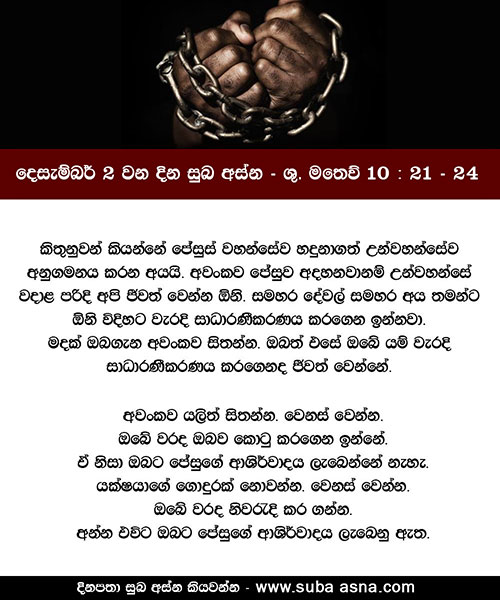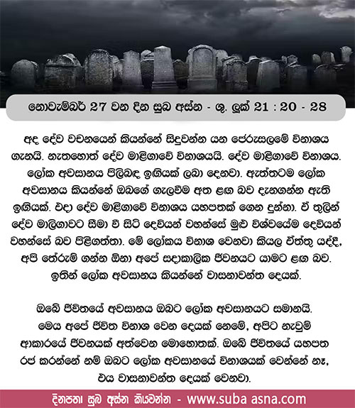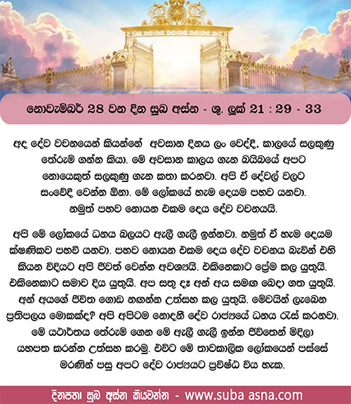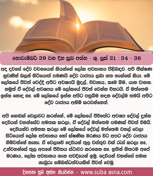 නොවැම්බර් 29 වන දින සුබ අස්න – ශු. ලූක් 21: 34 – 36ඒ දවස මලපතක් මෙන් හදිසියෙන් ඔබ අසුකර නොගන්නා පිණිස කම්සැපෙන් ද බීමත්කමෙන් ද මේ ජීවිතයේ කරදරවලින් ද ඔබේ සිත් නොවෙහෙසෙන හැටියට බලාගන්න.