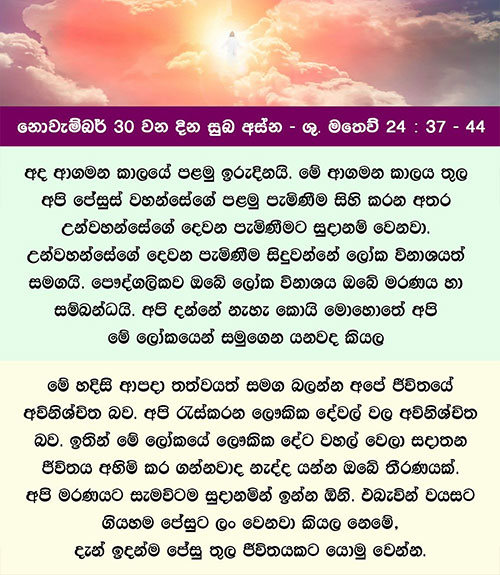නොවැම්බර් 30 වන දින සුබ අස්න – ශු. මතෙව් 24: 37 – 44අවදි ව ඉන්න. ඔබගේ සමිඳාණන් වහන්සේ කිනම් දවසක එන සේක් දැ යි ඔබ නොදන්නහු ය.