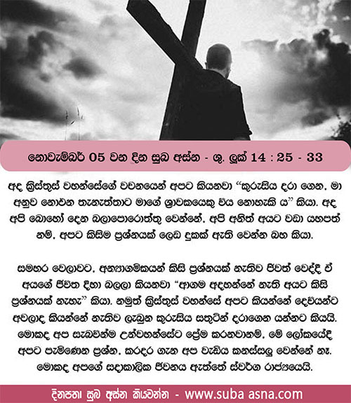 නොවැම්බර් 05 වන දින සුබ අස්න – ශු. ලූක් 14; 25 – 33මා වෙත එන තැනැත්තේ මට වඩා තම පියාට ද මවට ද භාර්යාවට ද දරුවන්ට ද සහෝදරයන්ට ද සහෝදරියන්ට ද තමාගේ ම ජීවිතයට වුව ද ප්රේම කරන්නේ නම්, ඔහුට මාගේ ශ්රාවකයෙක