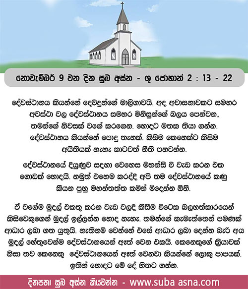 නොවැම්බර් 21 වන දින සුබ අස්න – ශු. ලූක් 19: 45 – 48මාගේ ගෘහය යාච්ඤාවේ ගෘහයක් වන්නේ ය’යි ලියා ඇත. එහෙත් ඔබ එය සොරුන්ගේ ගුහාවක් කර තිබේ ය