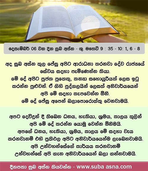 දෙසැම්බර් 06 වන දින සුබ අස්න – ශු. මතෙව් 9 : 35 – 10: 1, 6 – 8අස්වැන්න බහුල ය; ගොවීහු විරල ය. එහෙයින් අස්වැන්න කැපීමට ගොවීන් එවන ලෙස අස්වැන්න භාර හිමියා හට අයැදින්න. ( ශු. මතෙව් 9 : 37 )