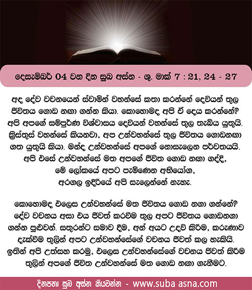 දෙසැම්බර් 04 වන දින සුබ අස්න – ශු. මතෙව් 7: 21, 24 – 27”ස්වර්ගයෙහි වැඩ වසන මාගේ පියාණන් වහන්සේගේ කැමැත්ත ඉටු කරන අය මිස මට, ‘ස්වාමීනි, ස්වාමීනි’යි කියන සියල්ලෝ ම ස්වර්ග රාජ්යයට ඇතුළු නොවන්නෝ ය.