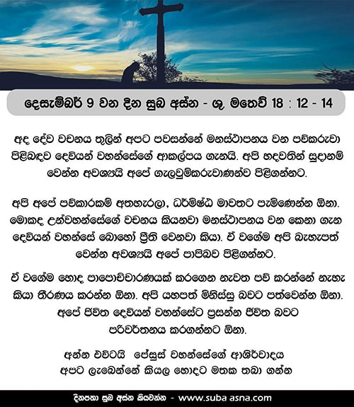 දෙසැම්බර් 9 වන දින සුබ අස්න – ශු. මතෙව් 18 : 12 – 14සැබැවින් ම ඔබට කියමි, ඌ සම්බ වුනොත් මුළා ව නොගිය අනූනව දෙනා ගැන ප්රීති වෙනවාට වඩා ඌ ගැන ප්රීති වන්නේ ය.