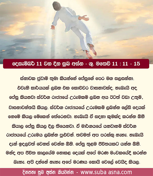 දෙසැම්බර් 11 වන දින සුබ අස්න – ශු. මතෙව් 11 : 11 – 15මුළු මිනිස් සංහතිය තුළ ජොහන්ට වඩා උතුම් කෙනෙක් පහළ නො වී ය. එහෙත් ස්වර්ග රාජ්යයෙහි ඉතා සුළු තැනැත්තේ වුව ද, ඔහුට වඩා උතුම් ය.