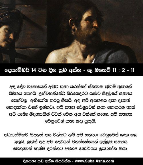 දෙසැම්බර් 14 වන දින සුබ අස්න – ශු. මතෙව් 11 : 2 – 11සැබැවින් ම මම ඔබට කියමි, මුළු මිනිස් සංහතිය තුළ ජොහන්ට වඩා උතුම් කෙනෙක් පහළ නො වී ය. එහෙත් ස්වර්ග රාජ්යයෙහි ඉතා සුළු තැනැත්තේ වුව ද, ඔහුට වඩා උතුම් ය