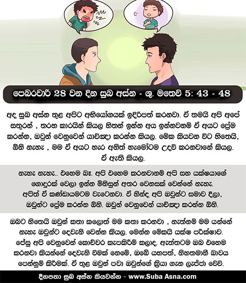 පෙබරවාරි 28 වන දින සුබ අස්න – ශු. මතෙව් 5: 43 – 48ඔබේ සතුරන්ට ප්රේම කරන්න; ඔබට පීඩා කරන්නන් උදෙසා යාච්ඤා කරන්න.