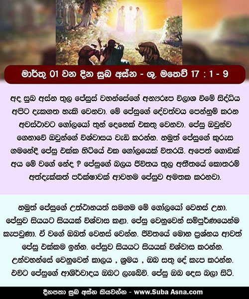 මාර්තු 01 වන දින සුබ අස්න – ශු. මතෙව් 17: 1 – 9ස්වාමීනි, අපට මෙහි සිටින්න ලැබීම වාසනාවකි; ඔබ කැමැති සේක් නම්, මණ්ඩප තුනක්,