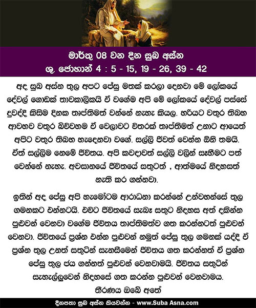 මාර්තු 08 වන දින සුබ අස්න – ශු. ජොහාන් 4: 5 – 15, 19 – 26, 39 – 42මා දෙන වතුර බොන කවර කෙනෙකුට වුවත් කිසි කලෙක පිපාසය ඇති නොවන්නේ ය. මා ඔහුට දෙන වතුර සදාතන ජීවනය පිණිස ඔහු තුළ දිය උල්පතක් වන්නේ ය