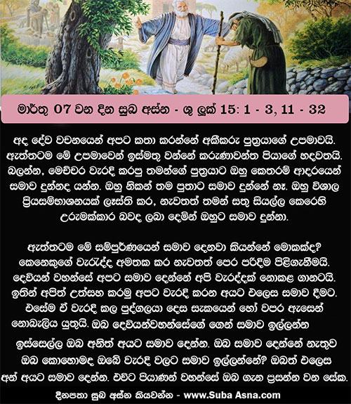 මාර්තු 07 වන දින සුබ අස්න – ශු. ලූක් 15: 1 – 3, 11 – 32නැතිවී සිට සම්බ වී ය’යි කී ය. එවිට ඔව්හු ප්රීති ප්රමෝද වන්න පටන්ගත්හ.