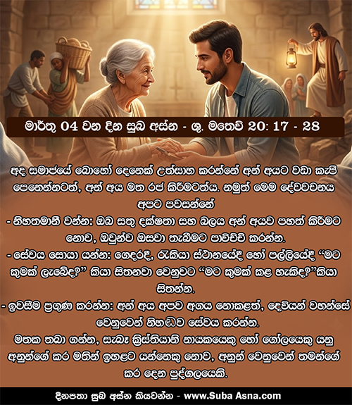 මාර්තු 04 වන දින සුබ අස්න – ශු. මතෙව් 20: 17 – 28සැබැවින් ඔබ මාගේ කුසලානෙන් බොන්නහු ය. එහෙත් මාගේ දකුණු පසෙහි ද වම් පසෙහි ද හිඳගන්න දීම මා සතු දෙයක් නොවේ. මාගේ පියාණන් විසින් ඒවා යම් අය සඳහා නියම කරන