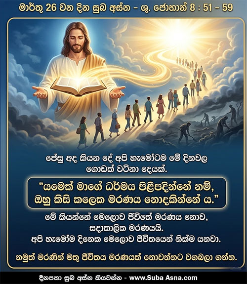 මාර්තු 26 වන දින සුබ අස්න – ශු. ජොහාන් 8 : 51 – 59යමෙක් මාගේ ධර්මය පිළිගන්නේ නම්, ඔහු කිසි කලෙක නොමැරෙන්නේ ය.