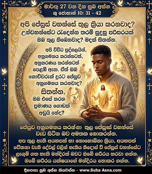 මාර්තු 27 වන දින සුබ අස්න – ශු. ජොහාන් 10 : 31 – 42අප ඔබට ගල් ගසන්නේ යහපත් ක්රියාවක් නිසා නොව, ඔබ කළ දේවාපහාසය නිසා ය; මිනිසෙකු වන ඔබ දෙවියන් වහන්සේ වෙන්නට බලන නිසා ය”යි කී හ.