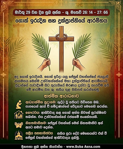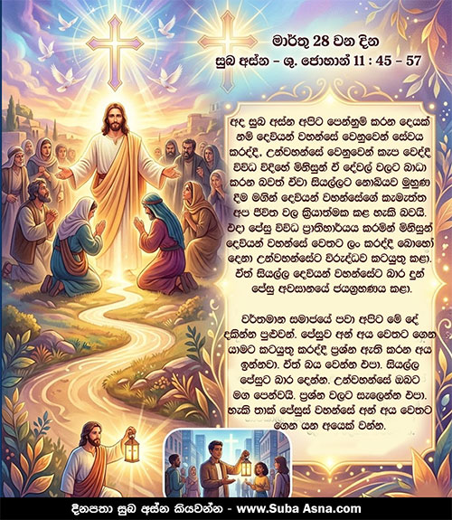 මාර්තු 28 වන දින සුබ අස්න – ශු. ජොහාන් 11 : 45 – 57පාස්කු මංගල්යයට තම තමන් පවිත්ර කරගන්නා පිණිස බොහෝ දෙනෙක් පිටිසරින් නික්ම ජෙරුසලමට ගියහ.