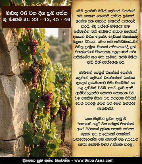 මාර්තු 06 වන දින සුබ අස්න – ශු. මතෙව් 21: 33 – 43, 45 – 46ගෘහ ශිල්පීන් ඉවත ලූ ගල ම, කොණේ ප්රධාන ගල වී ඇත.
