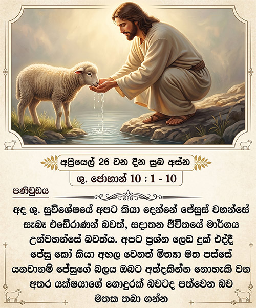 අප්රියෙල් 14 වන දින සුබ අස්න – ශු. ජොහාන් 3: 7 – 15පාළුකරයෙහි දී මෝසෙස් සර්පයා එසවූ ලෙස ම මනුෂ්ය-පුත්රයාණන් ද, 15 උන් වහන්සේ කෙරෙහි අදහාගන්නා සෑම දෙන ම සදාතන ජීවනය ලබන පිණිස, ඔසවනු ලබන්නට ඕනෑ ය.”