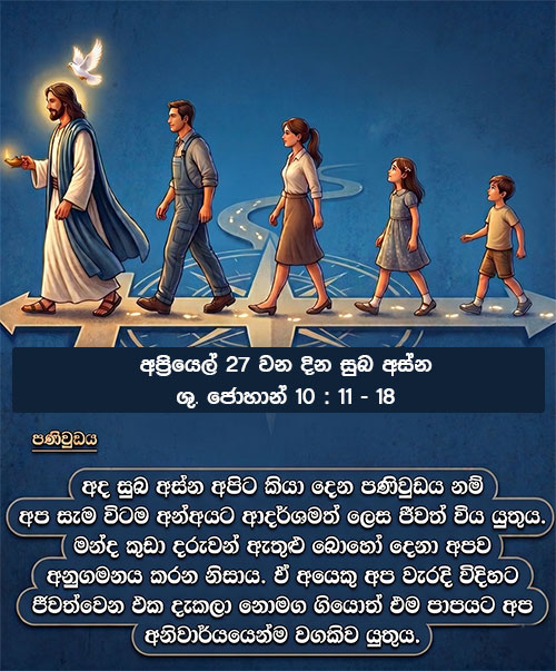 අප්රියෙල් 19 වන දින සුබ අස්න – ශු. ලූක් 24: 13 – 35උන් වහන්සේ අප හා සමඟ මඟ දී කතා කරද්දීත්, ශුද්ධ ලියවිල්ල පහදා දෙද්දීත්, අපේ හදවත දැවී ඇවිළී ගියා නොවේ දැ”යි එකිනෙකාට කී හ