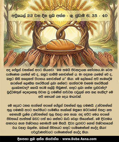 අප්රියෙල් 22 වන දින සුබ අස්න – ශු. ජුවාම් 6: 35 – 40ජීවනදායක ආහාරය මම ය, මා වෙත පැමිණෙන යමෙක් වේ ද, ඔහුට සාගිනි නොවන්නේ ය. මා අදහන යමෙක් වේ ද, ඔහුට කිසි කලෙකත් පිපාසය නොවන්නේ ය.
