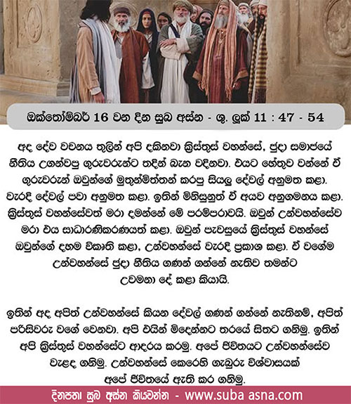 47 ඔබට වන විපතක මහත! ඔබගේ පියවරුන් අතින් මැරුම්කෑ දිවැසිවරයන්ගේ සොහොන් කොත් ඔබ ගොඩනඟන්නාහු ය. 48 එසේ කිරීමෙන් ඔබගේ පියවරුන්ගේ ඒ ක්රියා ඔබ අනුමත කරන බව සහතික කරන්නාහු ය; ඔව්හු ඔවුන් මැරූ හ. ඔබ ඔවුන්ගේ සොහොන් කොත් ගොඩනඟන්නාහු ය. 49 එහෙයින් දෙවියන් වහන්සේගේ ප්රඥාව පවසන ලෙස: ‘දිවැසිවරයන් ද ප්රේරිතයන් ද ඔවුන් වෙත යවන්නෙමි; මනුෂ්යයෝ ඔවුන්ගෙන් ඇතැමෙකුට තළා පෙළා ඇතැමෙකු මරාදමති.’ 50 මෙසේ ආබෙල්ගේ මරණයේ පටන්, පූජාසනය හා ශුද්ධස්ථානය අතර මරන ලද සෙකරියස්ගේ මරණය දක්වා, 51 ලෝකය මැවීමේ සිට වගුරුවන ලද සියලු දිවැසිවරයන්ගේ ලේ ගැන මේ පරම්පරාව වගකිව යුතු ය. එසේ ය, මේ පරම්පරාව ඒ ගැන වගකිව යුතු යයි මම ඔබට කියමි. 52 විනයධරයෙනි, ඔබට වන විපතක මහත! විද්යාවේ යතුරු ඔබ ගෙන ගියාහු ය; එහෙත් ඔබ ම ඇතුළු නොවූවහු ය; ඇතුළු වන්නන් ද වළක්වාලූවහු ය.”
