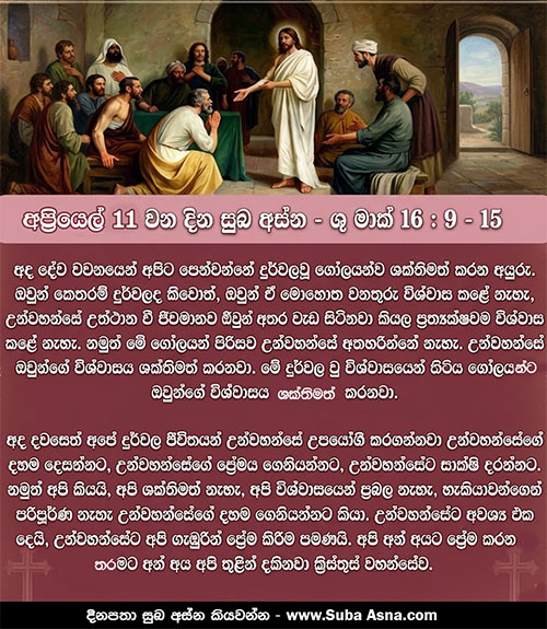 9 සතියේ පළමු වන දා අලුයම ජේසුස් වහන්සේ නැඟිට වදාළ කල, උන් වහන්සේ තමන් විසින් දුෂ්ටාත්මයන් සත් දෙනෙකු දුරු කරනු ලැබූ මග්දලායේ මරියාට මුලින් ම දර්ශනය වූ සේක. 10 ඈ ගොස්, අඬමින් වැලපෙමින් සිටි උන් වහන්සේගේ හිතවතුන්ට එපවත් සැළ කළා ය. 11 එහෙත්, උන් වහන්සේ ජීවමාන ව සිටින බව ද ඇයට දර්ශනය වූ බව ද ඇසූ විට ඔව්හු එය විශ්වාස නො කළහ. 12 ඉක්බිති ඔවුන්ගෙන් දෙදෙනෙකු පිටිසරට යන කල උන් වහන්සේ අන් විලසකින් ඔවුන්ට දර්ශනය වූ සේක. 13 ඒ දෙදෙන ආපසු ගොස් අනික් අයට එපවත් දැන්වූ හ. ඔව්හු ඔවුන් කී දෙය ද විශ්වාස නො කළහ. 14 පසුව ජේසුස් වහන්සේ, එකොළොස් දෙනා ආහාර වළඳමින් සිටිය දී ඔවුන්ට ද දර්ශනය වී, උන් වහන්සේ උත්ථාන වූ පසු තමන් වහන්සේ දුටුවන් කීදේ ඔවුන් නොඇදහූ නිසා, ඔවුන්ගේ අවිශ්වාසය හා සිත් දැඩි කම ගැන ඔවුන්ට දොස් පැවරූ සේක. 15 උන් වහන්සේ ඔවුන් අමතා, ”ලොව පුරා ගොස් සකල සත්ත්වයා හට සුබ අස්න දේශනා කරන්න;