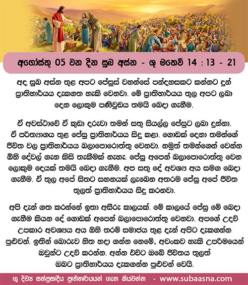 13 ජේසුස් වහන්සේ ඒ අසා එතැනින් නික්ම, ඔරුවකින් හුදකලා තැනකට වෙන් ව වැඩිය සේක. ජනකාය ඒ අසා නුවරවලින් පිටත් ව අවුත් උන් වහන්සේ පස්සේ පයින් ගියහ. 14 උන් වහන්සේ ගොඩ බැස, විශාල ජනකායක් දැක, ඔවුන් කෙරෙහි අනුකම්පා කොට, ඔවුන්ගේ රෝගීන් සුවපත් කළ සේක. 15 සවස් වූ කල ශ්රාවකයෝ උන් වහන්සේ වෙත අවුත්, ”මෙය පාළු තැනකි; දැන් රෑ බෝ වී ඇත; ගම්වලට ගොස්, කෑම මිලට ගන්නා පිණිස, සමූහයා යන්න හැරිය මැනවැ”යි කී හ. 16 ”ඔවුන් යවන්නට වුවමනාවක් නැත; ඔබ ඔවුන්ට කන්න දෙන්නැ”යි ජේසුස් වහන්සේ ඔවුන්ට වදාළ සේක. 17 ඔව්හු ද, ”අප ළඟ මෙහි ඇත්තේ රොටි පහකුත් මසුන් දෙදෙනෙකුත් පමණකැ”යි උන් වහන්සේට කී හ. 18 ”ඒවා මෙහි මා වෙත ගෙනෙන්නැ”යි උන් වහන්සේ වදාළ සේක. 19 තණ කොළ මත හිඳගන්නට ජනකායට අණ කොට, උන් වහන්සේ රොටි පහත්, මසුන් දෙදෙනාත් ගෙන, ස්වර්ගය දෙස බලා ආශීර්වාදය පවසා, රොටි කඩා ශ්රාවකයන්ට දුන් සේක. ශ්රාවකයෝ ද එය සෙනඟට දුන්හ. 20 හැම දෙනම කා තෘප්තියට පැමිණියහ. ඔව්හු ඉතිරි කැබලි එක් කොට කූඩා දොළසක් පුරවාගත්හ. 21 ස්ත්රීන් හා දරුවන් හැර, කෑම කෑ පුරුෂයෝ පන්දහසක් පමණ වූ හ.