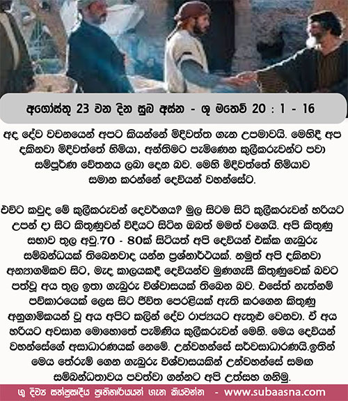 8 ”සවස් වූ කල මිදි වත්ත හිමියා සිය කළමනාකාරයාට කතා කොට, ‘කුලීකරුවන් කැඳවා අන්තිමට ආ අයගෙන් පටන්ගෙන පළමු වැන්නා දක්වා ඔවුන් හැමට කුලිය ගෙවන්නැ’යි කී ය. 9 එවිට සවස පහට පමණ වැඩට ආ අය අවුත් එක එක මිනිසා රිදී කාසිය බැගින් ලැබූ හ. 10 මුලින් ම වැඩට ගිය අය ආ විට තමන්ට ඊට වැඩියෙන් ලැබෙනු ඇතැයි සිතූ හ. එහෙත්, ඔව්හු ද එක එක මිනිසා රිදී කාසියක් බැගින් ලැබූ හ. 11 එසේ ලැබූ ඔව්හු ඉඩම් හිමියාට විරුද්ධ ව දොස් කියමින්, 12 ‘මේ අන්තිමට ආ අය වැඩ කෙළේ එක පැයක් පමණි. එහෙත්, අවු රස්නය නොබලා මුළු දවසේ ම වෙහෙස මහන්සි වූ අපටත් ඔබ රිදී කාසියක කුලිය ම ගෙවන්නෙහි ය’යි කී හ. 13 එහෙත්, ඔහු ඔවුන්ගෙන් කෙනෙකුට උත්තර දෙමින්, ‘යහළුව, මා ඔබට අයුත්තක් කරනවා නොවේ. ඔබ මා සමඟ රිදී කාසියක කුලියට එකඟ වුණා නොවේ ද? 14 ඔබට දුන් කුලිය රැගෙන යන්න; ඔබට ගෙවූ ලෙස ම මේ අන්තිමයාටත් ගෙවීම මාගේ කැමැත්ත ය. 15 මා සන්තක දෙයින් මා කැමැති දෙයක් කිරීමට මට අයිතියක් තිබෙනවා නොවේ ද? මා කාරුණික බැවින් ඔබ ඊර්ෂ්යා වන්නේ මන්දැ’යි ඇසී ය. 16 මෙසේ අන්තිමයෝ ප්රථමයෝ ද ප්රථමයෝ අන්තිමයෝ ද වන්නෝ ය.”