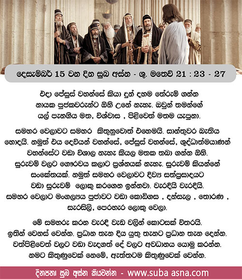 23 උන් වහන්සේ දේව මාලිගාවට ඇතුළු ව උගන්වමින් සිටිය දී නායක පූජකවරු ද ප්රජා මූලිකයෝ ද උන් වහන්සේ වෙතට අවුත්, ”ඔබ මේ දේ කරන්නේ කුමන අධිකාරි බලයකින් ද? මේ බලය ඔබට පැවරුවේ කවරෙක් දැ”යි ප්රශ්න කළහ. 24 ජේසුස් වහන්සේ උත්තර දෙමින්, ”මමත් ඔබගෙන් ප්රශ්නයක් විචාරමි. ඔබ එය මට කියන්නහු නම්, මේ දේවල් කරන්නේ කුමන අධිකාරි බලයකින් දැ යි මමත් ඔබට කියමි. 25 බව්තීස්ම-ස්නාපනය කිරීමේ බලය ජොහන් ලැබුවේ කවරෙකුගෙන් ද? දෙවියන් වහන්සේගෙන් ද? නොහොත් මනුෂ්යයන්ගෙන් දැ”යි ඇසූ සේක. ඔව්හු තම තමන් අතර තර්ක කරමින්, ” ‘දෙවියන් වහන්සේගෙන් ය’යි කීවොත්, ‘එසේ නම් ඔබ ජොහන් විශ්වාස නොකෙළේ මන්දැ’යි අපෙන් අසනු ඇත. 26 ‘මනුෂ්යයන්ගෙන් ය’යි කීවොත්, ජොහන් දිවැසිවරයෙකු බව සියලු දෙනාම පිළිගෙන ඇති හෙයින් සමූහයාට මුහුණ දීමට අපට නො හැකිවනු ඇත” යනුවෙන් තම තමන් අතර තර්ක කරමින් සිට, බියෙන්, ”අපි නොදනිමු”යි ජේසුස් වහන්සේට උත්තර දුන්හ. 27 උන් වහන්සේ කතා කරමින්, ”කවර අධිකාරි බලයකින් මම මේ දේවල් කරම් දැ යි මමත් ඔබට නොකියමි”යි ඔවුන්ට වදාළ සේක.
