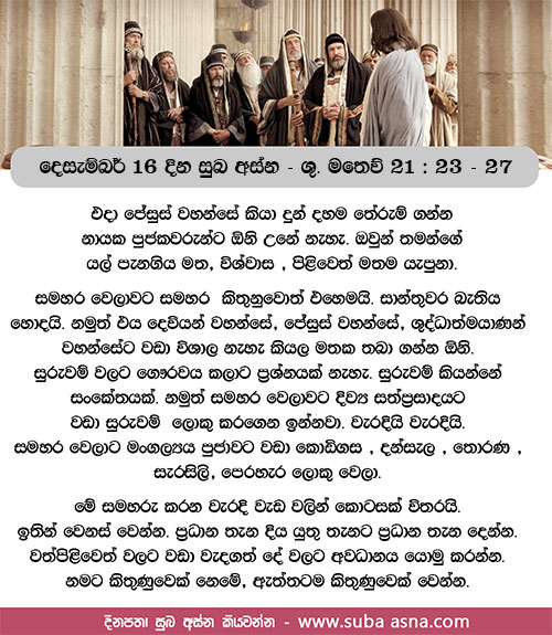 23 උන් වහන්සේ දේව මාලිගාවට ඇතුළු ව උගන්වමින් සිටිය දී නායක පූජකවරු ද ප්රජා මූලිකයෝ ද උන් වහන්සේ වෙතට අවුත්, ”ඔබ මේ දේ කරන්නේ කුමන අධිකාරි බලයකින් ද? මේ බලය ඔබට පැවරුවේ කවරෙක් දැ”යි ප්රශ්න කළහ. 24 ජේසුස් වහන්සේ උත්තර දෙමින්, ”මමත් ඔබගෙන් ප්රශ්නයක් විචාරමි. ඔබ එය මට කියන්නහු නම්, මේ දේවල් කරන්නේ කුමන අධිකාරි බලයකින් දැ යි මමත් ඔබට කියමි. 25 බව්තීස්ම-ස්නාපනය කිරීමේ බලය ජොහන් ලැබුවේ කවරෙකුගෙන් ද? දෙවියන් වහන්සේගෙන් ද? නොහොත් මනුෂ්යයන්ගෙන් දැ”යි ඇසූ සේක. ඔව්හු තම තමන් අතර තර්ක කරමින්, ” ‘දෙවියන් වහන්සේගෙන් ය’යි කීවොත්, ‘එසේ නම් ඔබ ජොහන් විශ්වාස නොකෙළේ මන්දැ’යි අපෙන් අසනු ඇත. 26 ‘මනුෂ්යයන්ගෙන් ය’යි කීවොත්, ජොහන් දිවැසිවරයෙකු බව සියලු දෙනාම පිළිගෙන ඇති හෙයින් සමූහයාට මුහුණ දීමට අපට නො හැකිවනු ඇත” යනුවෙන් තම තමන් අතර තර්ක කරමින් සිට, බියෙන්, ”අපි නොදනිමු”යි ජේසුස් වහන්සේට උත්තර දුන්හ. 27 උන් වහන්සේ කතා කරමින්, ”කවර අධිකාරි බලයකින් මම මේ දේවල් කරම් දැ යි මමත් ඔබට නොකියමි”යි ඔවුන්ට වදාළ සේක.