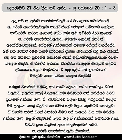 1 සතියේ පළමු වන දා හිමිදිරියේ ම, අඳුර තිබිය දී, මග්දලායේ මරියා සොහොන් ගෙය ළඟට අවුත්, සොහොන් ගෙයින් ගල ඉවත් කොට තිබෙන බව දුටුවා ය. 2 එබැවින් ඈ සීමොන් පේදුරු ද ජේසුස් වහන්සේ ප්රේම කළ අනික් ශ්රාවකයා ද වෙත දුව ගොස්, ”ඔවුන් සමිඳාණන් වහන්සේ සොහොන් ගෙයින් ඉවතට ගෙන ගොස් තිබේ; ඔවුන් උන් වහන්සේ කොතැනක තැබුවා ද කියා අපි නොදනිමු”යි කීවා ය. 3 එවිට පේදුරු ද අනික් ශ්රාවකයා ද නික්ම විත් සොහොන් ගේ දෙසට ගියහ. 4 දෙදෙනා ම එක් ව දිව්වෝ ය. අනික් ශ්රාවකයා පේදුරු පසු කර දුව ගොස් පළමුවෙන් සොහොන් ගෙට පැමිණ, 5 නැමී බලා, සිහින් හණ රෙදි එහි තිබෙන බව දිටී ය. එහෙත් ඔහු ඇතුළට නොගියේ ය. 6 සීමොන් පේදුරු ඔහුට පසුව පැමිණ සොහොන් ගේ ඇතුළට ගොස්, හණ රෙදි එහි තිබෙන බවත්, 7 උන් වහන්සේගේ හිස ඔතා තිබූ රෙදි කඩ, හණ රෙදි සමඟ නොව, වෙන ම එක් තැනෙක අකුළා තිබෙන බවත් දුටුවේ ය. 8 එකල සොහොන් ගේ ළඟට පළමුවෙන් පැමිණි ඒ අනික් ශ්රාවකයා ද, ඇතුළට ගොස් දැක විශ්වාස කෙළේ ය. 9 උන් වහන්සේ මළවුන්ගෙන් නැඟිට වදාළ යුතු යයි ලියන ලද ශුද්ධ ලියවිල්ල, ඒ වන තුරු ඔවුන් තේරුම් ගෙන සිටියේ නැත. 10 ඉක්බිති ශ්රාවකයෝ තම තමන්ගේ නිවෙස්වලට හැරී ගියහ.