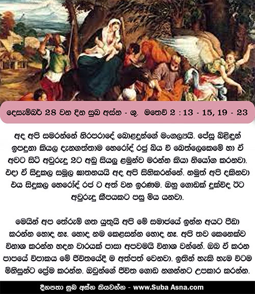 13 ඔවුන් ගිය පසු සමිඳාණන් වහන්සේගේ දූතයෙක් සිහිනයකින් ජෝසෙප්ට දර්ශනය වී, ඔහු අමතා, ”නැඟිට ළදරුවා ද උන් වහන්සේගේ මෑණියන් ද රැගෙන මිසරයට ගොස්, මා දන්වන තුරු එහි නවතින්න. මන්ද, හෙරොද් රජ ළදරුවා මරාදැමීමට සොයති”යි කී ය. 14 ඔහු රාත්රියෙහි නැඟිට ළදරුවා ද උන් වහන්සේගේ මෑණියන් ද රැගෙන මිසරයට ගොස්, 15 හෙරොද්ගේ මරණය දක්වා එහි සිටියේ ය. මෙසේ වූයේ,
