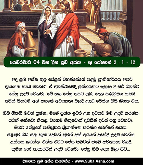 1 තුන් වන දවසෙහි, ගලීලයේ කානාහි විවාහ මංගල්යයක් විය; ජේසුස් වහන්සේගේ මෑණියෝ ද එහි සිටියහ. 2 සිය ශ්රාවකයන් සමඟ ජේසුස් වහන්සේ ද මංගල්යයට කැඳවනු ලැබූ සේක. 3 මිදියුස හිඟ වූ විට, ජේසුස් වහන්සේගේ මෑණියෝ, ”මිදියුස නැතැ”යි උන් වහන්සේට කී හ. 4 ජේසුස් වහන්සේ ද කතා කොට, ”ස්ත්රිය, ඔබත් මාත් මේ ගැන කරදර වෙන්නේ කුමට ද? මාගේ මොහොත තව ම පැමිණ නැතැ”යි වදාළ සේක. 5 උන් වහන්සේගේ මෑණියෝ මෙහෙකරුවන් අමතා, ‘මෙතුමාණන් ඔබට කියන කොයි දෙයක් වුව ද කරන්නැ’යි කී හ.