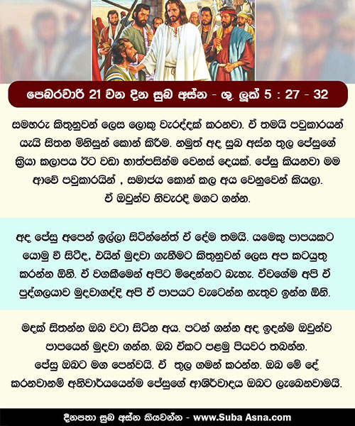 27 ඉක්බිති උන් වහන්සේ නික්ම ගොස් ලෙවී නම් අයකැමියෙකු බදුපොළේ හිඳිනු දැක, ”මා අනුව එන්නැ”යි ඔහුට වදාළ සේක. 28 ඔහු සියල්ල අත්හැරදමා නැඟිට උන් වහන්සේ අනුව ගියේ ය. 29 ලෙවී සිය නිවෙසෙහි උන් වහන්සේට මහා භෝජන සංග්රහයක් පිළියෙළ කෙළේ ය. අයකැමියන් හා වෙනත් අයගෙන් මහත් පිරිසක් ඔවුන් සමඟ කෑමට හිඳගත්හ. 30 එකල පරිසිවරු ද ඔවුන්ගේ විනයධරයෝ ද උන් වහන්සේගේ ශ්රාවකයන්ට විරුද්ධ ව චෝදනා කරමින්, ”ඔබ අයකැමියන් ද පව්කාරයන් ද සමඟ කන්නේත් බොන්නේත් මන්දැ”යි ඇසූ හ. 31 ජේසුස් වහන්සේ ඔවුන්ට පිළිතුරු දෙමින්, ”රෝගීන්ට මිස නිරෝගීන්ට වෙදාගෙන් වැඩක් නැත. 32 මා ආයේ, පවිටුන් මිස දමිටුන් පසුතැවී සිත් හරවා ගැනීමට කැඳවීම පිණිස නොවේ ය”යි වදාළ සේක.