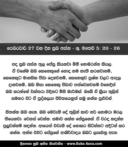 20 මන්ද, ඔබ ධර්මිෂ්ඨකමින් විනයධරයන් ද පරිසිවරුන් ද ඉක්මවා නොගියොත්, ඔබ කිසි සේත් ස්වර්ග රාජ්යයට නොපිවිසෙන්නහු ය යි ඔබට කියමි. 21 ” ‘මිනී නොමරන්න; මිනී මරන කවරෙකු වුව ද විනිශ්චයට යටත් වනු ඇතැ’යි පැරැන්නන්ට කී බව ඔබ අසා ඇත. 22 එහෙත්, මම ඔබට කියමි, තමාගේ සහෝදරයා සමඟb කෝප වන කවරෙකු වුව ද ඔහු අධිකරණයට යටත් වනු ඇත. තමාගේ සහෝදරයාට ‘මෝඩයා’ කියා ගරහන කවරෙකු වුව ද ඔහු ශ්රේෂ්ඨාධිකරණයට යටත් වනු ඇත; ‘ජඩයා’ කියා ගරහන කවරෙකු වුව ද ඔහු නිරා ගින්නට ගොදුරු වනු ඇත. 23 එබැවින් ඔබ පූජාසනය වෙත පඬුරක් ගෙනෙන කල, ඔබේ සහෝදරයා ඔබට විරුද්ධ ව යම් කිසි අමනාපයක් ඇති ව සිටින බව එහි දී සිහි වී නම්, 24 පඬුර පූජාසනය ඉදිරියෙහි තබා ගොස්, පළමුකොට සහෝදරයා හා සමගි වී, පසුව අවුත් පඬුර පුදන්න.